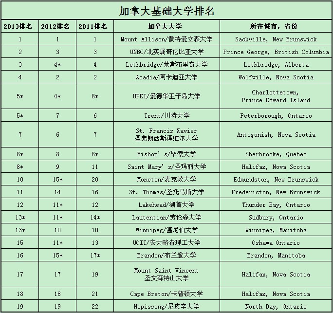 2013年11月1日《麥考林》雜志發(fā)布了最新一次的加拿大大學(xué)排名。由于加拿大政府機構(gòu)不對大學(xué)進(jìn)行官方排名,因此該排名已成為加拿大本土學(xué)生及國際學(xué)生了解加拿大大學(xué)的一份重要指南。