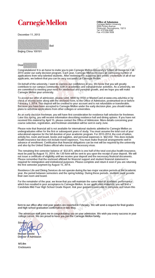 申請(qǐng)過(guò)程中不加多說(shuō),6月份簽約9月份完成所有文書、essay的修改,特別想要說(shuō)的是,由于今年coom的申請(qǐng)系統(tǒng)改版以后,在學(xué)校的成績(jī)達(dá)到學(xué)?;疽蟮那疤嵯拢瑢W(xué)生綜合能力是美國(guó)學(xué)校重點(diǎn)考慮的錄取因素,不會(huì)因?yàn)槟愕挠⒄Z(yǔ)和gpa好,沒(méi)有任何活動(dòng)而錄取學(xué)生。所以在接下來(lái)的申請(qǐng)中,同學(xué)一定要注意如何寫essay,這個(gè)至關(guān)重要。對(duì)于申請(qǐng)藝術(shù)類的學(xué)生作品集也非常重要,作品集要以你申請(qǐng)的專業(yè)為主,附加你其他方面的動(dòng)手能力。通過(guò)作品集可以把你的綜合能力更直觀的體現(xiàn)出來(lái)。10月份我們順利提交了ea和ed的學(xué)校。12月初的ed的錄取下來(lái)了。