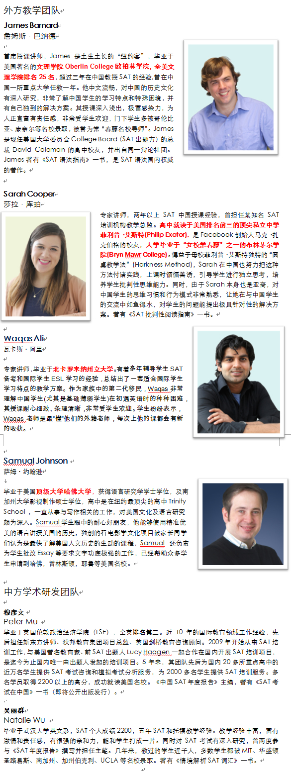 1.國內唯一專業(yè)全外教SAT團隊,SAT教學經(jīng)驗超過5年,高分學員過千;