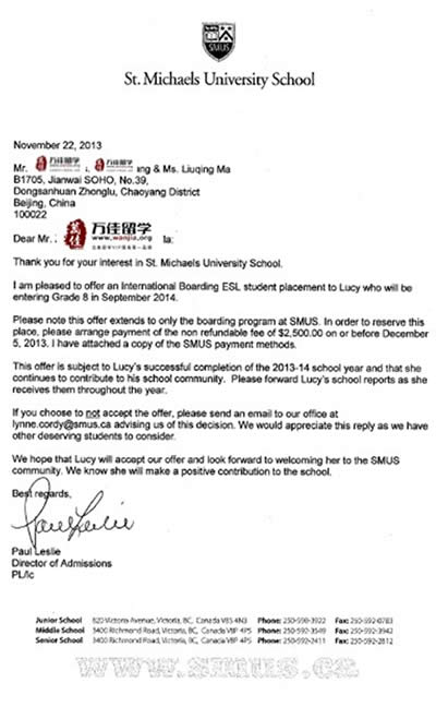 從2013年9月與我簽約。10月遞交申請,11月參加第一次SKYPE面試。12月份參加現(xiàn)場面試,并在12月份SSAT考出2100分,爸爸仍堅持說沒有考好,應該可以考更高。兩周后學校發(fā)來郵件通知LUCY已經被圣邁克錄取?;仡櫤灱s到拿到OFFER這個過程。第一,因為簽約時間非常早,學校那邊剛開放申請就已經把所有材料遞交學校。學校第一時間拿到了學生的申請,所以才11月份就有了第一次SKYPE面試。