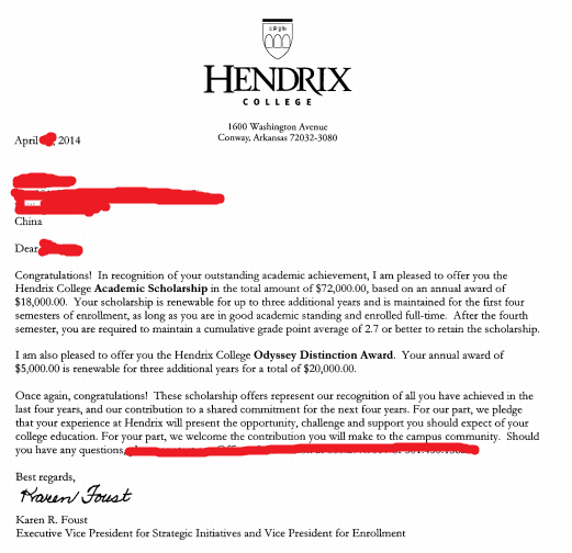 4月20日,早晨一打開(kāi)郵箱,映入我們眼簾的便是Kate同學(xué)的offer,打開(kāi)郵件,結(jié)果讓我們大吃一驚。Hendrix admitted!9萬(wàn)2千美金的獎(jiǎng)學(xué)金!除了激動(dòng)還是激動(dòng)...
