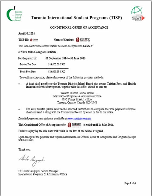 基于EILEEN語言很優(yōu)秀,并且在2013年12月就開始做申請(qǐng),York Mill是一所在國(guó)際上以及當(dāng)?shù)厝丝诒挤浅:玫膶W(xué)校,社區(qū)設(shè)施齊全,居民整體收入在多倫多地區(qū)算是富人區(qū),治安良好。所以這么好的學(xué)校我們年前就將申請(qǐng)遞交。很多很好的公立中學(xué)都不是完全根據(jù)學(xué)生條件錄取,而是根據(jù)名額來錄取的。提前申請(qǐng)才是最重要的,沒有名額再優(yōu)秀也是不行的。但由于今年多倫多公立教育審理緩慢,導(dǎo)致知道4月30日才收到錄取的通知書。