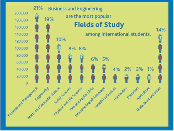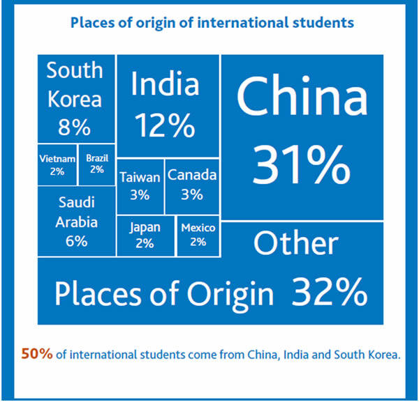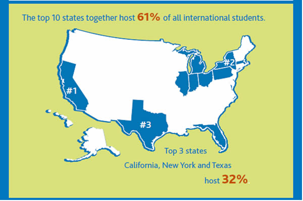 加州,紐約州和德州是最熱門的地區(qū), 32%國(guó)際學(xué)生就讀