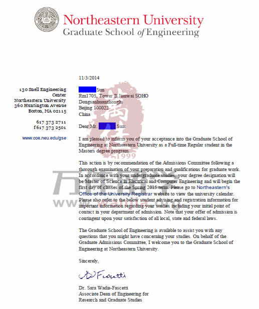 在孫同學(xué)準(zhǔn)備語(yǔ)言期間,我們保持與申請(qǐng)學(xué)校的溝通并及時(shí)反饋孫同學(xué)對(duì)學(xué)校的向往和對(duì)專業(yè)的理解。在2014年暑假期間,孫同學(xué)的托福成績(jī)達(dá)到80分,GRE313分。我們成功拿到孫同學(xué)理想大學(xué)的offer。